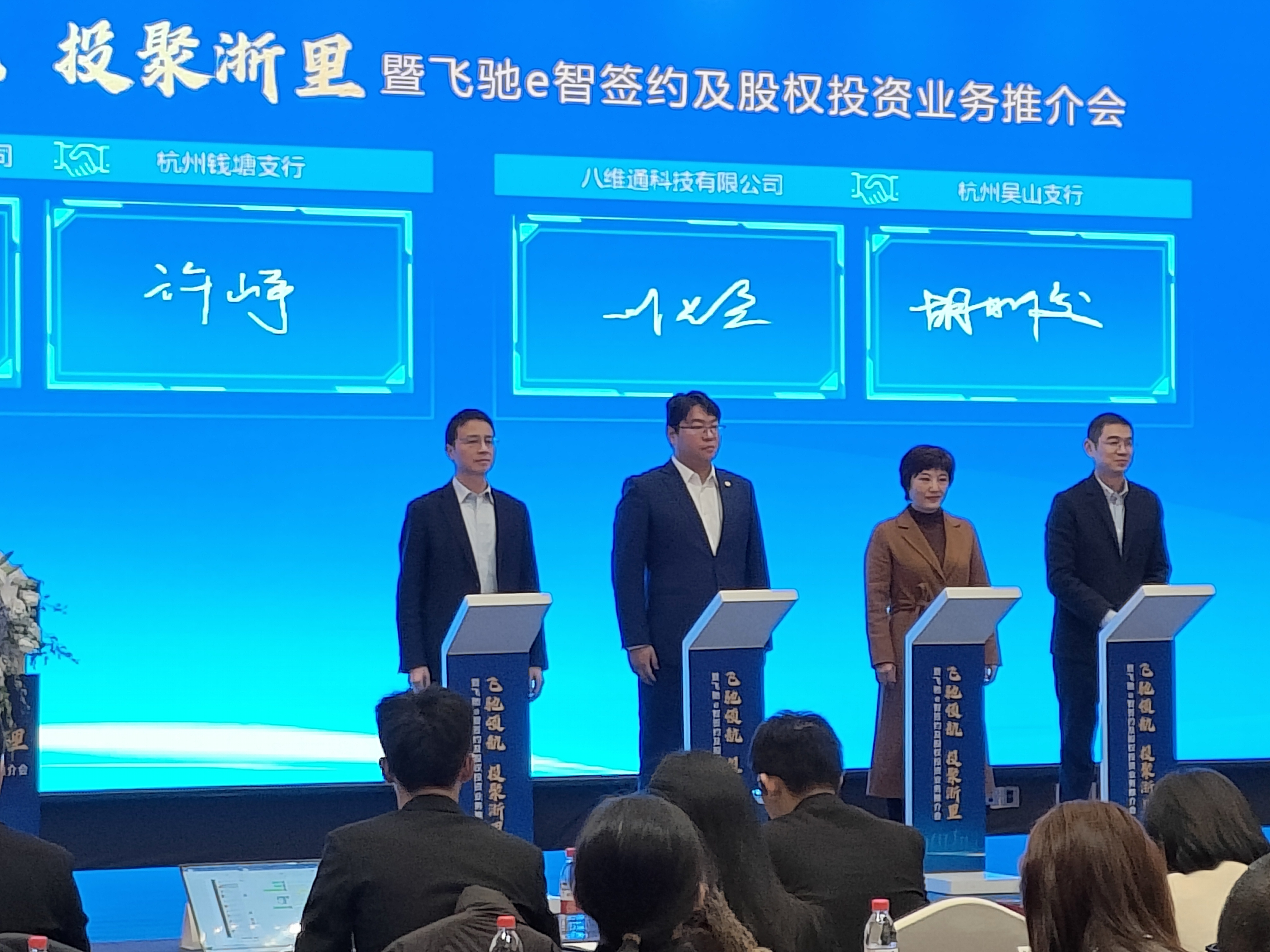 12月4日,由建設銀行浙江省分行主辦的飛馳e智簽約會在杭州成功舉辦。八維通科技有限公司常務副總劉曉宏女士受邀出席會議,并代表八維通與建行杭州吳山支行簽訂飛馳e智數字投顧...