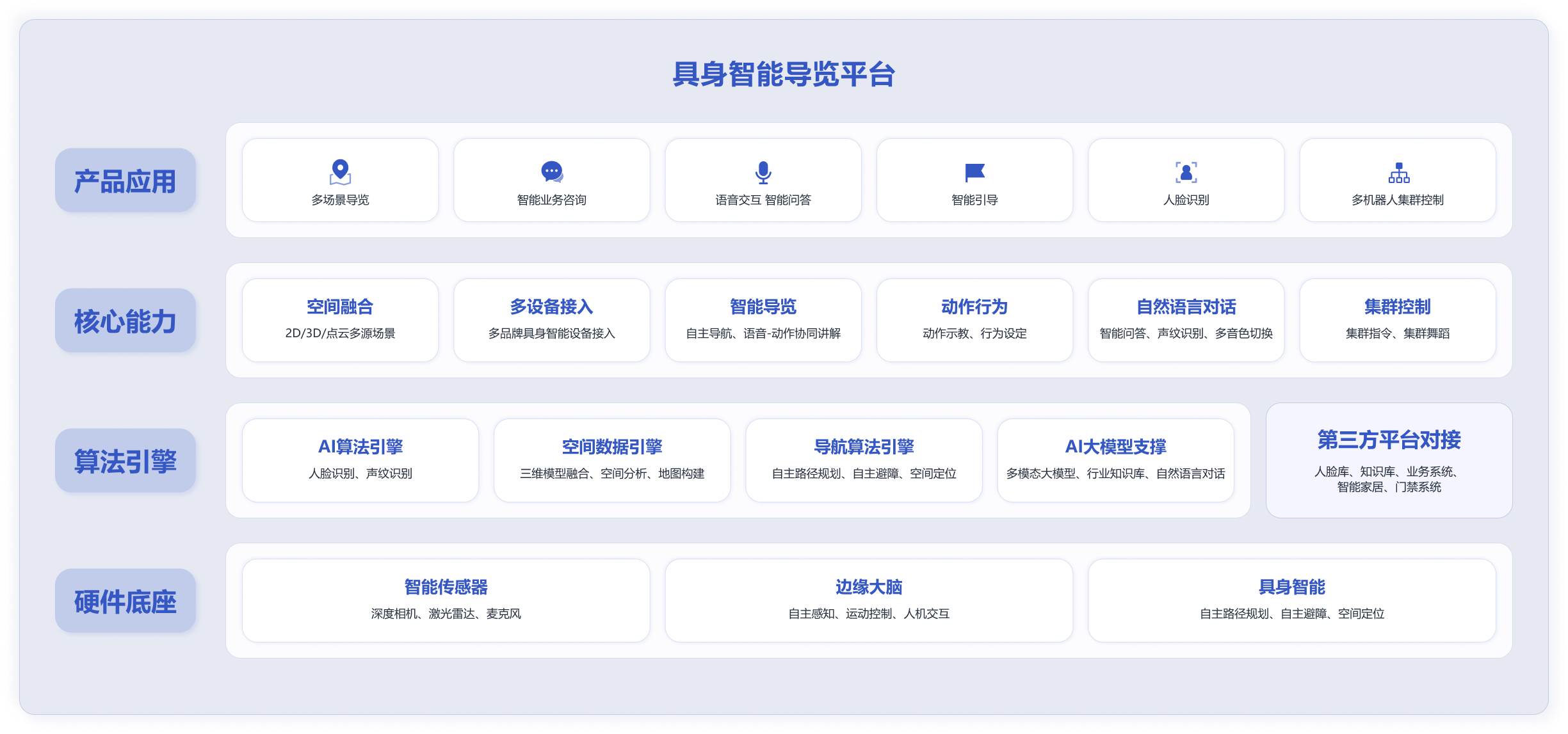 整合業界領先的多模態大模型,實現深度智能交互,通過對接行業知識庫與AI智能體,使機器人從基礎導航導覽,升級為可精準解決復雜業務問題的智能顧問