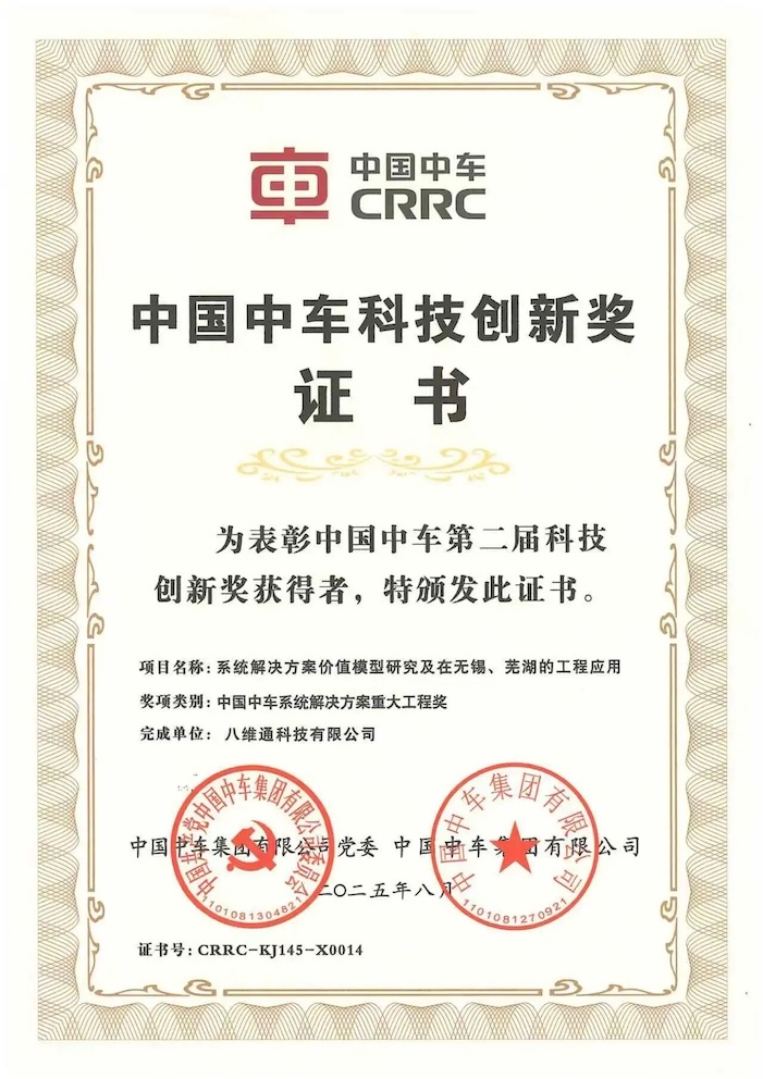 近日,中國中車集團有限公司第二屆科技創新獎評選結果正式揭曉。八維通科技有限公司憑借“系統解決方案價值模型研究及在無錫、蕪湖的工程應用”與“面向‘產品+’業務車地一體化機電系統集成研究及應用”榮獲中國中車第二屆科技創新獎雙項“系統解決方案重大工程獎”。